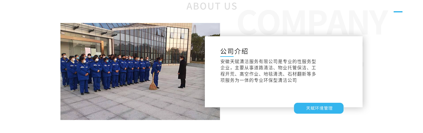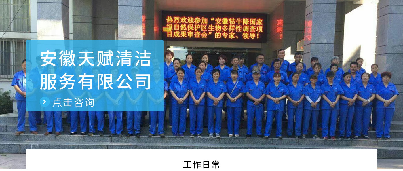 安徽天賦清潔服務(wù)有限公司是的服務(wù)型企業(yè),主要從事道路清潔、物業(yè)托管保潔、工程開荒、高空作業(yè)、地毯清洗、石材翻新等多項(xiàng)服務(wù)為一體的環(huán)保型清潔公司。公司管理機(jī)制完善,清潔作業(yè)經(jīng)驗(yàn)豐富,擁有技術(shù)力量,嚴(yán)格實(shí)行崗前培訓(xùn)—崗中督查—上崗在培訓(xùn)的員工管理措施,憑著優(yōu)良的清潔質(zhì)量和嚴(yán)格的督查管理,為眾多企事業(yè)單位、醫(yī)院、酒店、廠區(qū)商場(chǎng)、物業(yè)、道路、學(xué)校、公園等提供后勤清潔服務(wù)。在業(yè)內(nèi)擁有良好的口碑。工作人員,服務(wù)態(tài)度優(yōu),竭力為客戶提供好的保潔服務(wù)。安徽天賦清潔服務(wù)有限公司:致力于長(zhǎng)期合作關(guān)系,提高服務(wù)質(zhì)量,提供高標(biāo)準(zhǔn)的清潔服務(wù)。公司的經(jīng)營(yíng)理念:為營(yíng)造一個(gè)更清潔、亮麗的生活和工作環(huán)境而努力!“誠(chéng)信”是公司成功保證。“客戶至上,信譽(yù)為首”是公司宗旨。高標(biāo)準(zhǔn)提供服務(wù),維護(hù)客戶利益、形象,是我始終不渝的目標(biāo)。